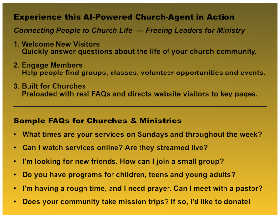 Want this AI-Powered Church-Agent on your website?Subscribe to the AI Agent package that best serves your mission,